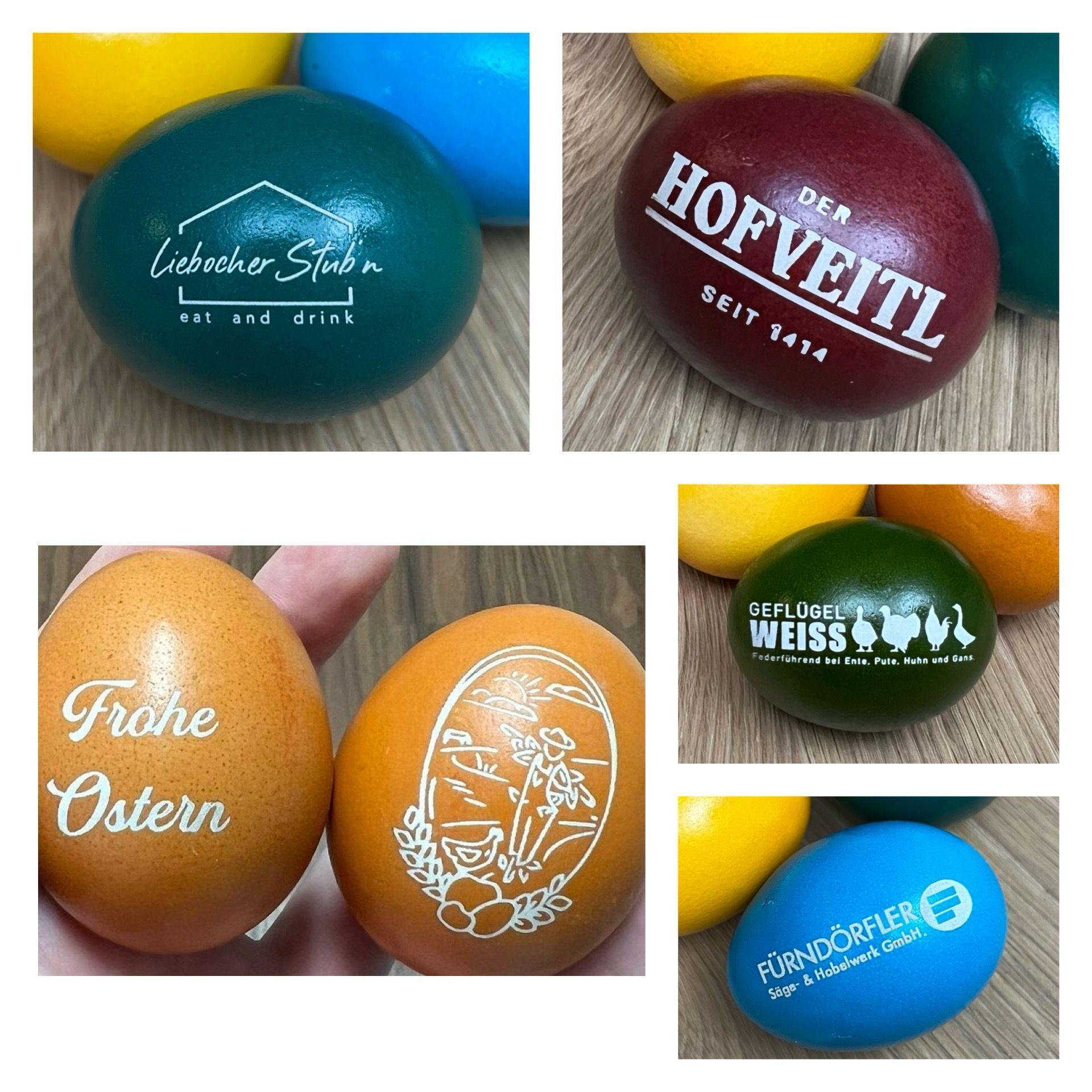 • Ostereier als Firmengeschenk: Gefärbte, gekochte Ostereier mit Wünschen oder Firmenlogos graviert